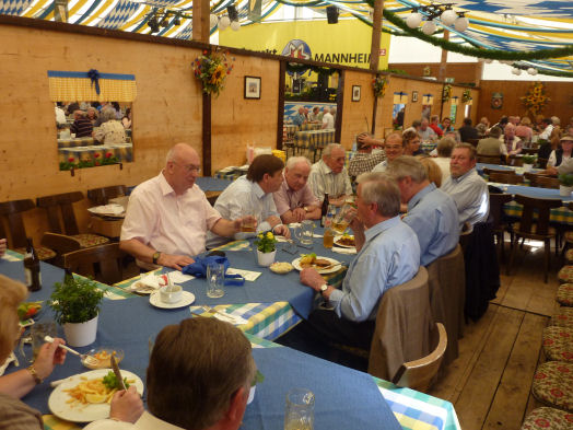 Gemeinsame Stärkung im “Stüberl” des FestzeltesEs ist schon seit Jahren eine gute Tradition, dass die SPD-Fraktion im Verband Region Rhein-Neckar dem Mannheimer Maimarkt einen Besuch abstattet. Die deutschlandweit größte Regionalschau heimischer Produkte gehört wie fast kein zweites Event zur Metropolregion und ist alle Jahre wieder ein Spiegelbild der Leistungsfähigkeit des sechstgrößten Wirtschaftsraumes unserer Republik. Eingeladen zu dem Rundgang der SPD-Fraktion waren auch die in jüngster Zeit ausgeschiedenen Fraktionsmitglieder, darunter die beiden langjährigen Fraktionsvorsitzenden und Träger der Hermann-Heimerich-Medaille Georg Kohler (Edingen-Neckarhausen) und Heinrich Zier (Limburgerhof). Zu Beginn trafen sich die Teilnehmer im “Stüberl” des Festzeltes Brandl zu einer gemeinsamen Stärkung. Im Rahmen seiner Begrüßung informierte Fraktionsgeschäftsführer Helmut Beck in Vertretung des verhinderten Fraktionsvorsitzenden Matthias Baaß über die aktuell anstehenden Aufgaben des Verbandes; wie beispielsweise die in Kürze anstehende Anhörung zum ersten einheitlichen Regionalplan für die gesamte Region Rhein-Neckar, die Entscheidung über das Erfordernis eines sog. Regionalflughafens, die sich aus der Energiewende ergebenden regionalplanerischen Maßnahmen oder auch die geplante Ansiedlung eines großflächigen Verbrauchermarktes (FOC / DOC) in Sinsheim. Alles Themen, die insbesondere bei den “Ehemaligen” auf großen Interesse trafen.